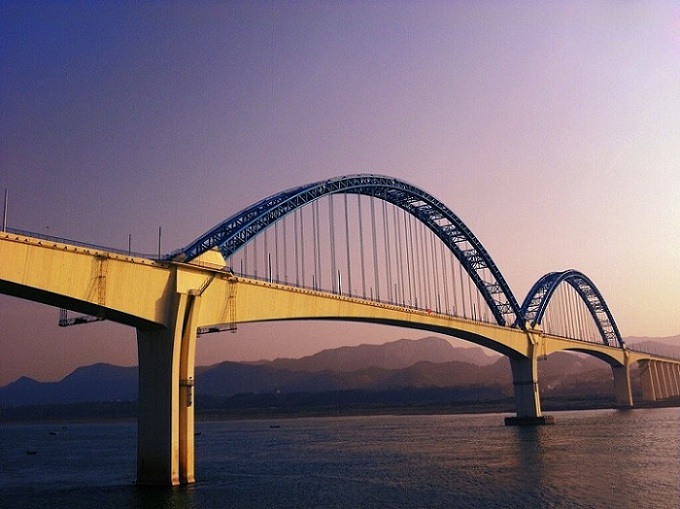宜萬(wàn)鐵路宜昌長(zhǎng)江大橋位于宜昌港煙收壩水域,全長(zhǎng)2527米,橋面設(shè)計(jì)為雙軌道,主梁連續(xù)剛構(gòu)跨徑達(dá)275米,在同類(lèi)型鐵路橋中位居全國(guó)第一。拱肋計(jì)算跨度264米,為目前國(guó)內(nèi)鐵路最大跨度的鋼管混凝土拱。